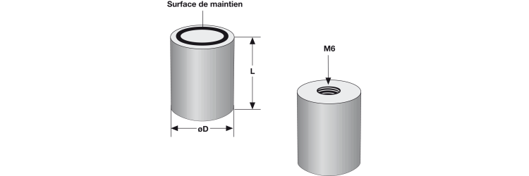 These magnets are known in English-speaking countries as 'Deep Pot Magnets'. The ALCOMAX alloy magnet is incorporated with an aluminum intermediate ring in the soft iron base. The force is thus concentrated on the holding surface. These rolled magnets comprise, on the opposite side to the holding surface, a threaded hole M6 for fixing. Max. of use: + 200 ° C. Outside surface: lacquered.